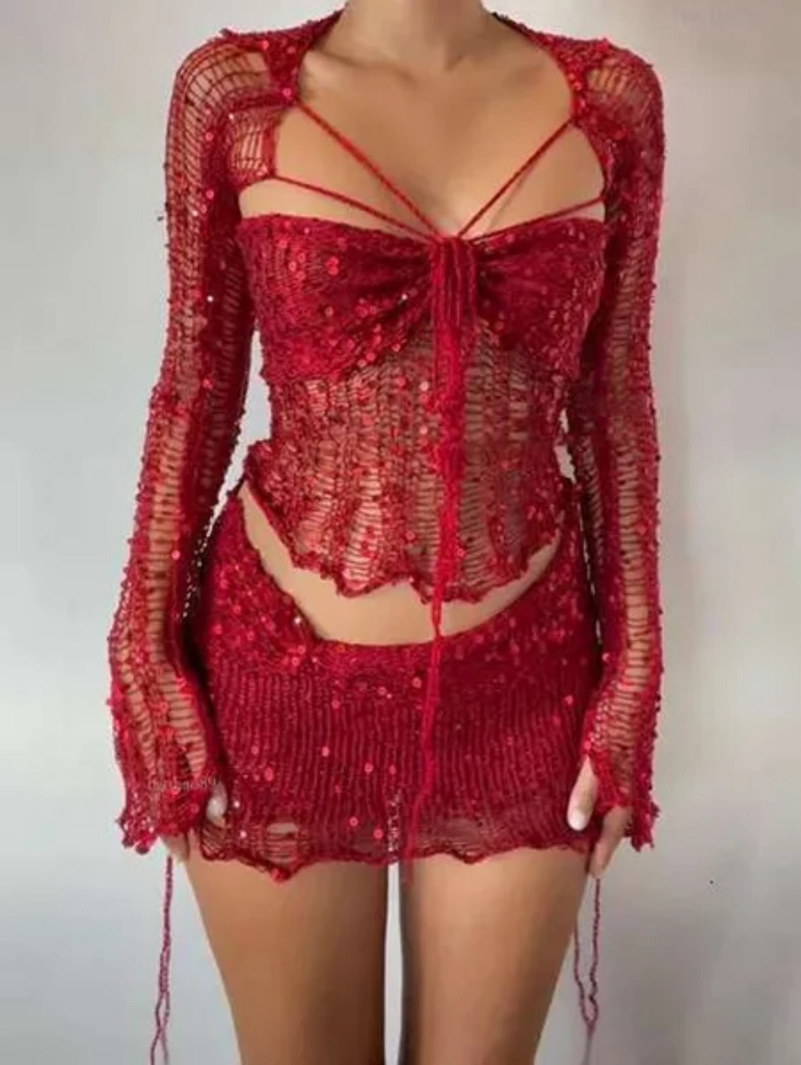 β¨π₯ Pacha Nights β Crochet Festival Co-ord with Sequins (Red) π₯β¨